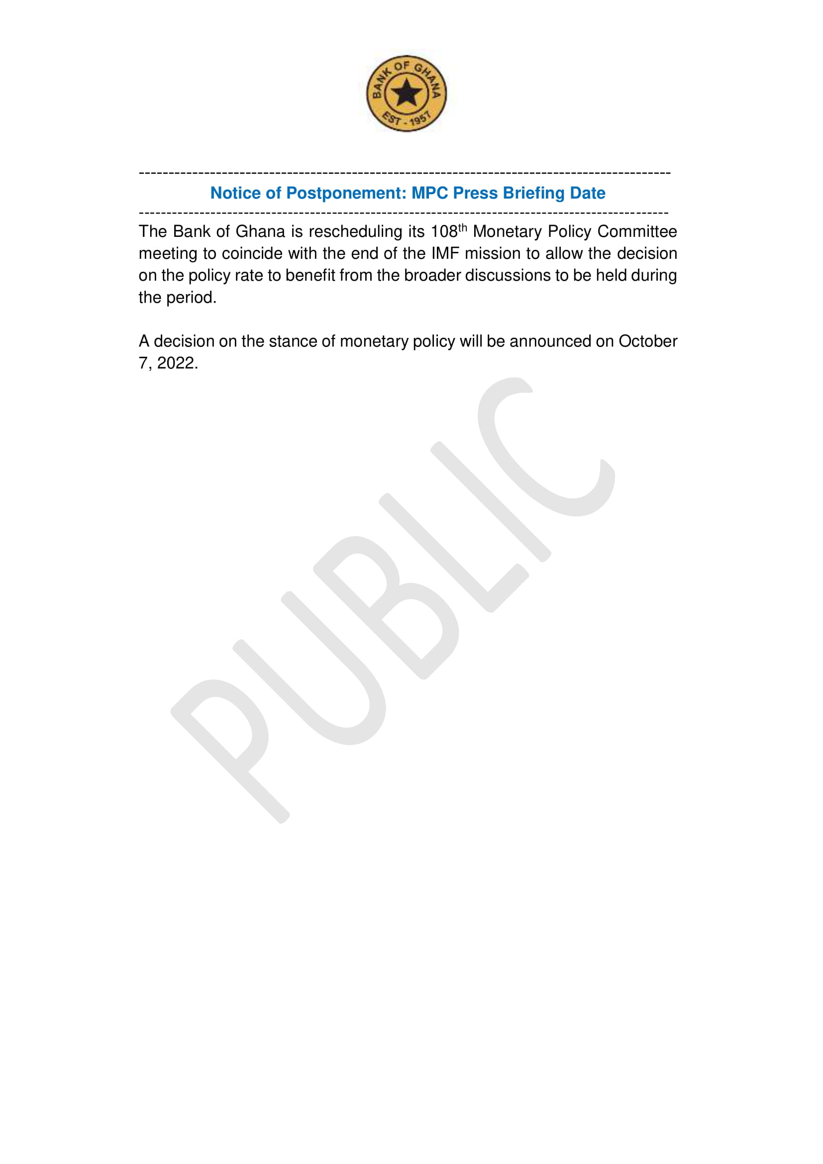 “The Bank of Ghana is rescheduling its 108th Monetary Policy Committee meeting to coincide with the end of the IMF mission to allow the decision on the policy rate to benefit from the broader discussions to be held during the period. A decision on the stance of monetary policy will be announced on 7 October 2022,” the statement explained.