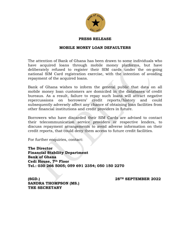 In a statement dated September 28, BoG stated that its “attention has been drawn to some individuals who have acquired loans through mobile money platforms, but have deliberately refused to register their SIM cards under the ongoing national SIM Card registration exercise, with the intention of avoiding repayment…”