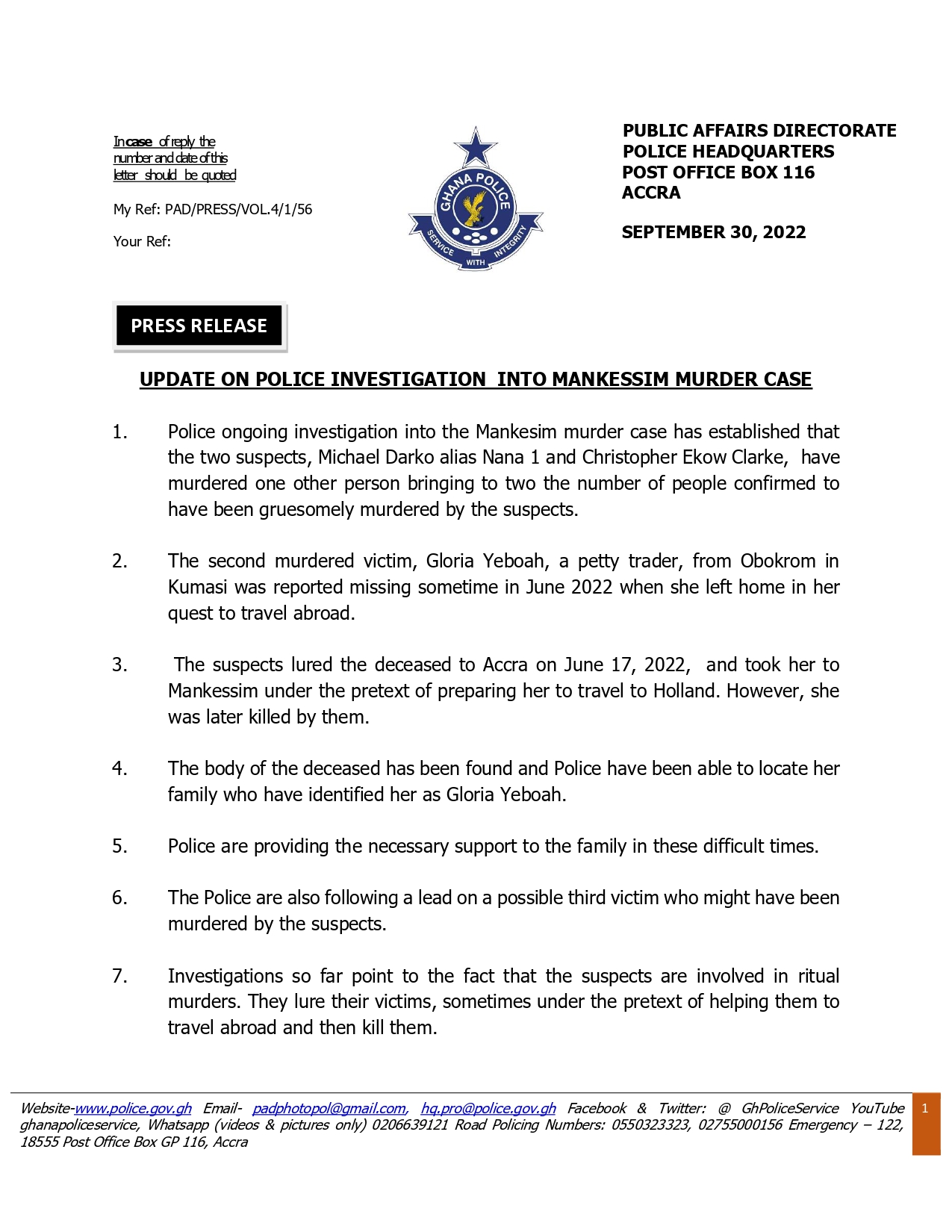 Police’s ongoing investigation into the Mankessim murder case has established that the two suspects, Michael Darko alias Nana 1 and Christopher Ekow Clarke, have murdered one other person.