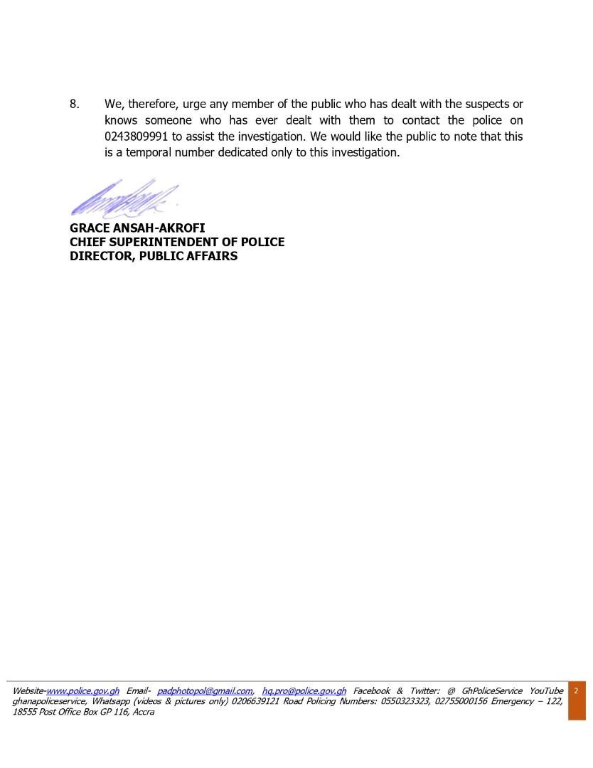 The police have further appealed to members of the public who have dealt with the suspects or know someone who has ever dealt with them to contact the police on 0243809991 to assist the investigation.