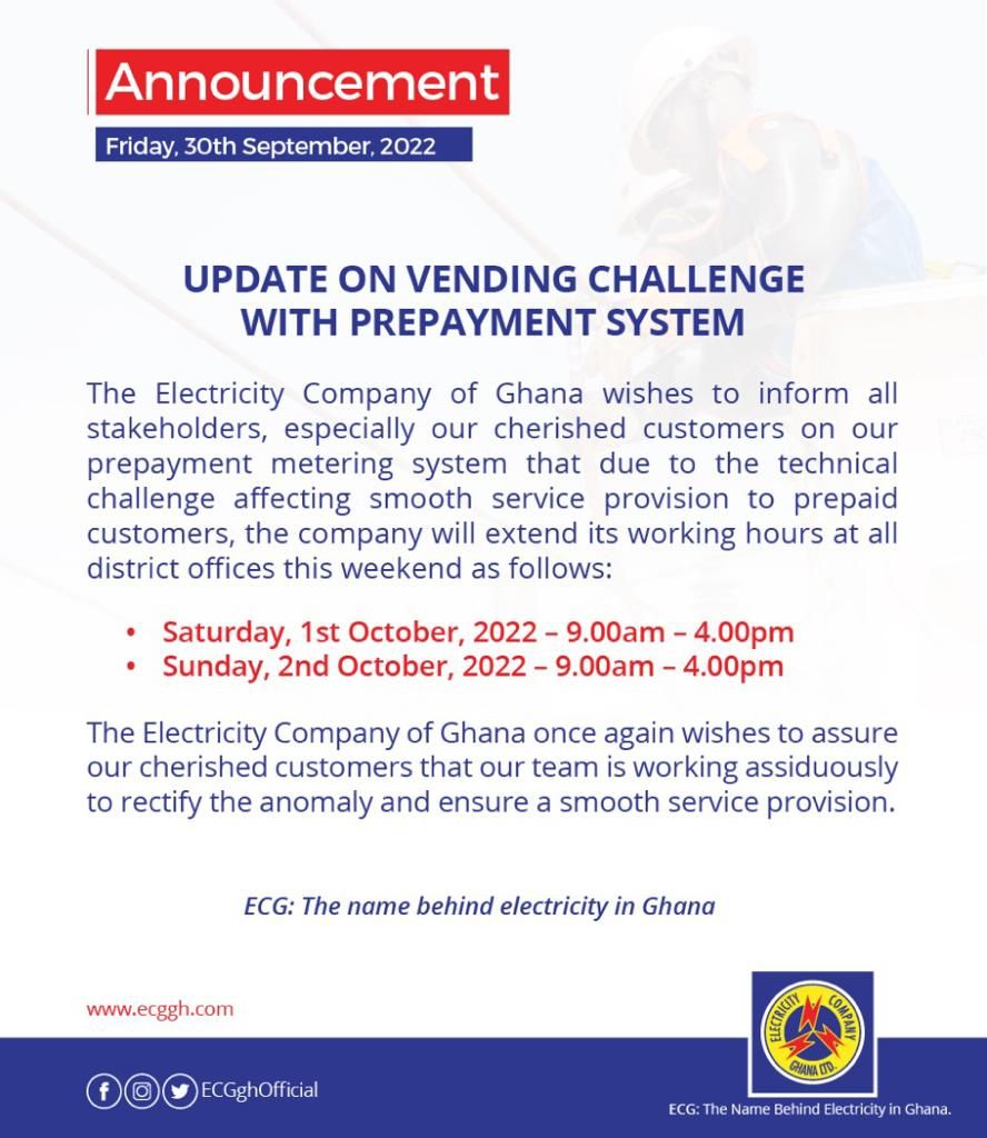 The Electricity Company of Ghana (ECG) has extended its working hours to 4:00pm due to vending challenge with their prepayment system.