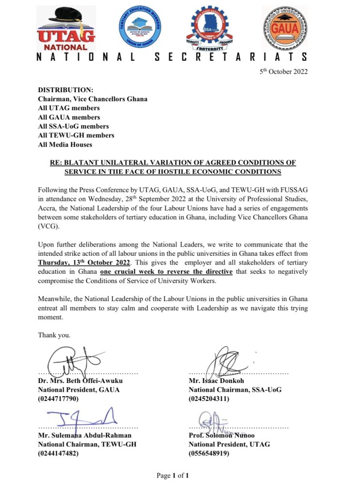 The statement reads “Upon further deliberations among the National Leaders, we write to communicate that the intended strike action of all labour unions in the public universities in Ghana takes effect from Thursday, 13 October 2022.”