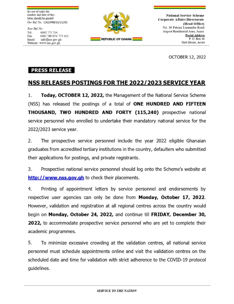 Service personnel have been advised to start printing their appointment letters for endorsement starting Monday, October 17, 2022 after visiting the scheme’s website http://www.portal.nss.gov.gh for confirmation of their place of posting.