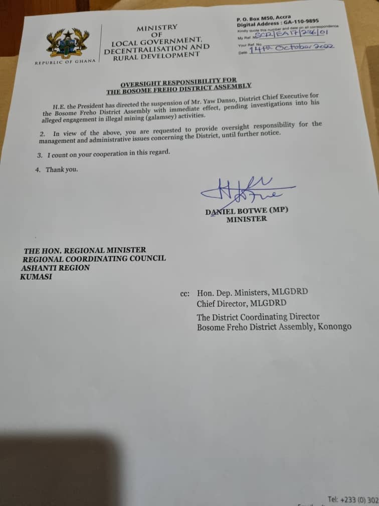 “The president has directed the suspension of Yaw Danso, district chief executive for Bosome Freho District Assembly with immediate, pending investigations into his alleged engagement in illegal mining (galamsey) activities.