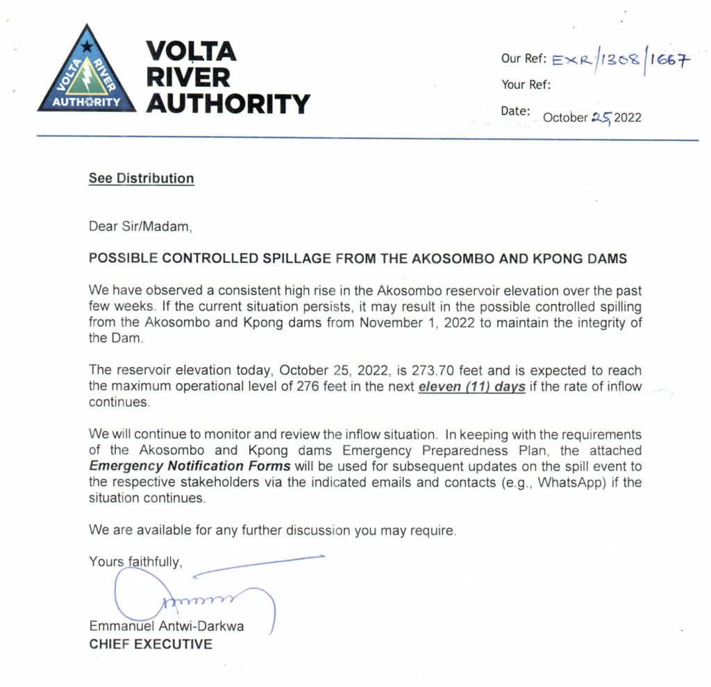 In a statement, VRA said “we have observed a consistent high rise in the Akosombo reservoir elevation over the past few weeks. If the current situation persists, it may result in the possible controlled spilling from the Akosombo and Kpong dams from November 1, 2022, to maintain the integrity of the Dam.”