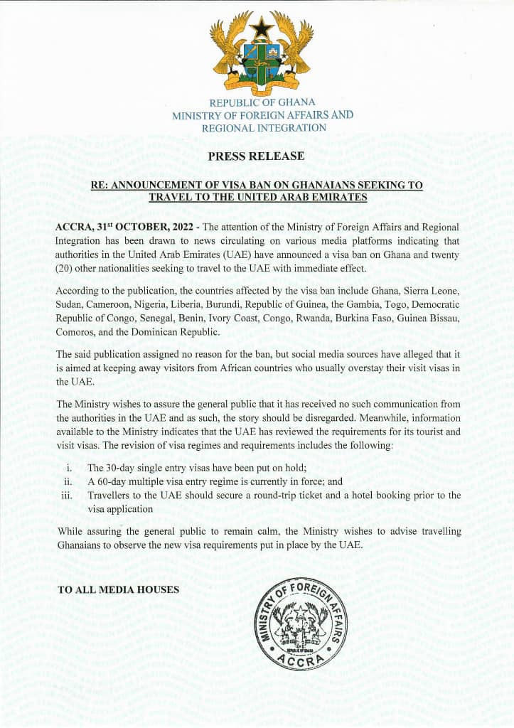 It comes following news circulation which indicated that United Arab Emirates (UAE) have announced a visa ban on Ghana and twenty (20) other nationalities seeking to travel to the UAE with immediate effect.