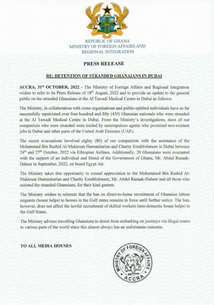Over 450 Ghanaians who were stranded at the Al Tawadi Medical Centre in Dubai in August 2022 have been successfully repatriated.