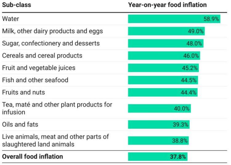 The rest included Fruits and nuts (44.4%), Tea, maté and other plant products for infusion (40.0%), Oils and fats (39.3%), Live animals, meat and other parts of slaughtered land animals (38.8%) and Overall food inflation (37.8%).