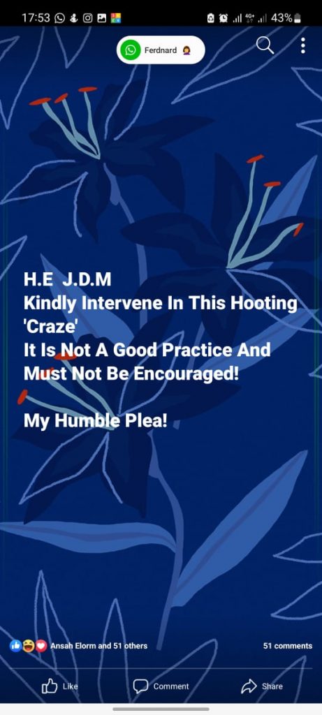 “H.E J.D.M Kindly Intervene In This Hooting ‘Craze’ It Is Not A Good Practice And Must Not Be Encouraged!”, he wrote on Facebook.