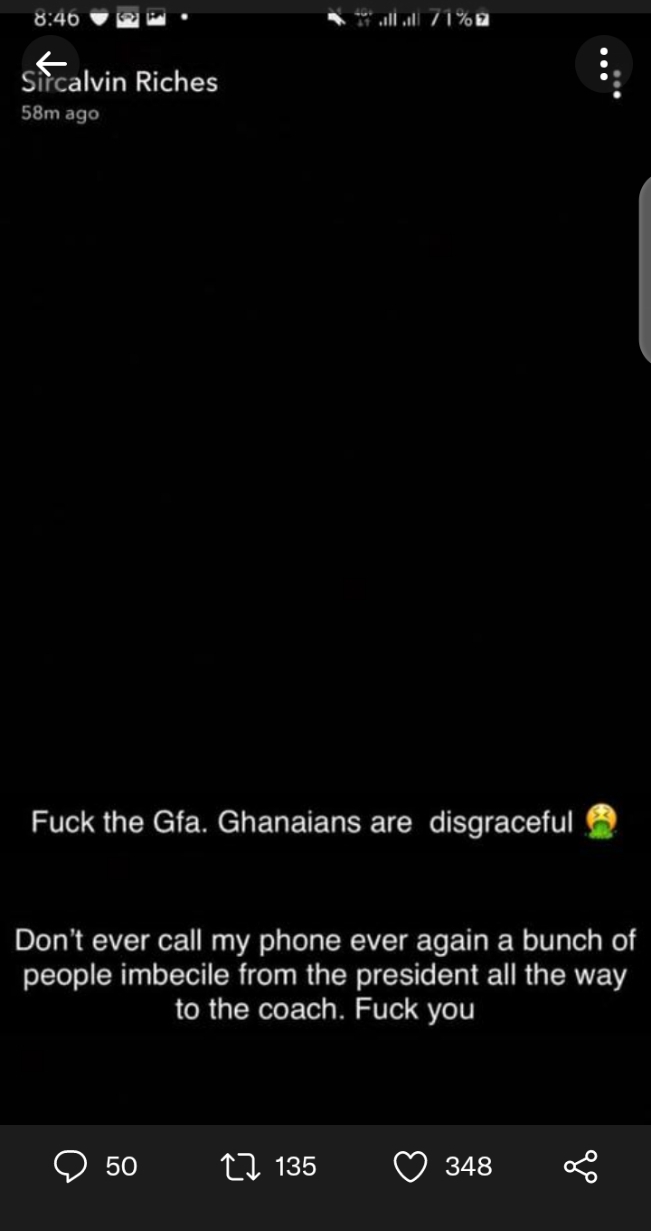 “Fuck the GFA. Ghanaians are disgraceful. Don’t ever call my phone ever again, a bunch of people imbecile from the president all the way to the coach. Fuck you. A bunch of criminals @ghana fa official… corruption,” he posted.