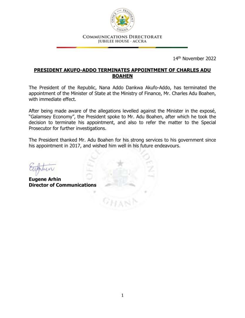 “After being made aware of the allegations levelled against the Minister in the expose “Galamsey Economy” the President spoke to Mr Adu Boahen, after which he took the decision to terminate his appointment, and also to refer the matter to the Special Prosecutor for further investigations.”