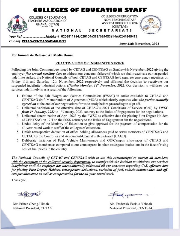 The Colleges of Education Teachers Association of Ghana (CETAG) and the Colleges of Education Non-Teaching Staff Association of Ghana (CENTSAG) have begun their indefinite strike in all 46 Colleges of Education across the country.