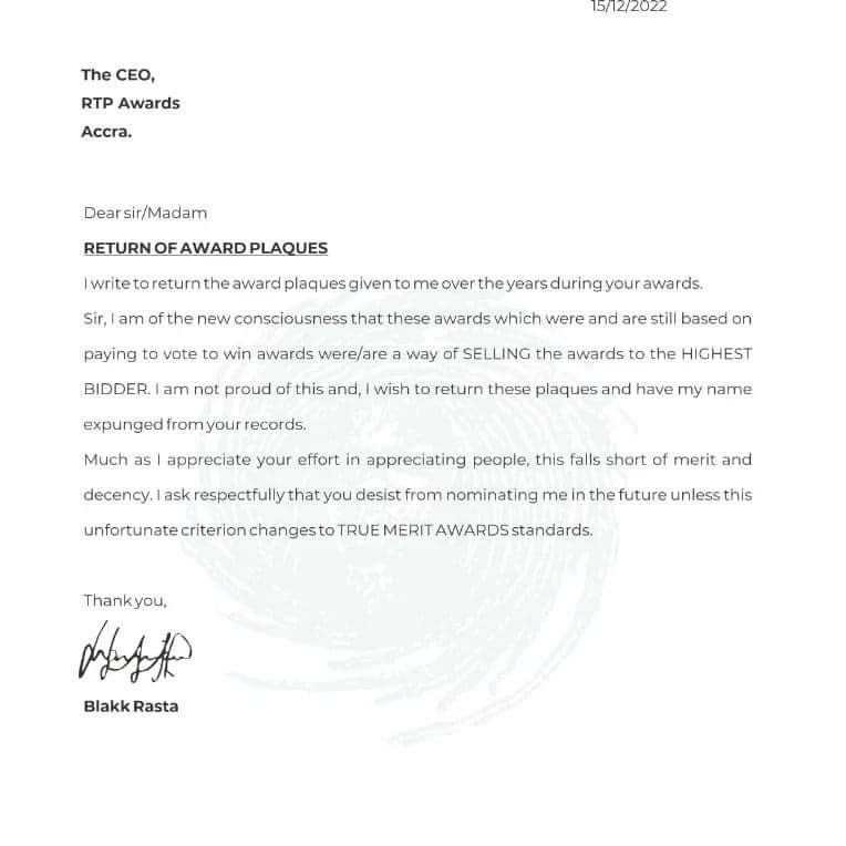 Ghanaian reggae musician, Blakk Rasta, has respectively warned organizers of the Radio and Television (RTP) Awards to desist from including him in their future award schemes.