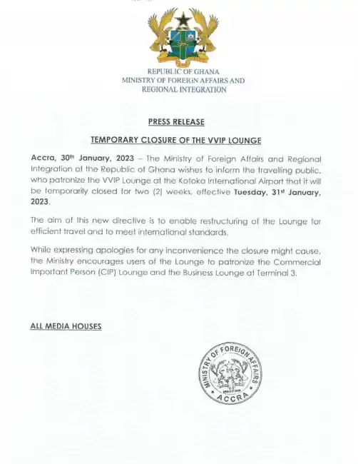 “The Ministry of Foreign Affairs and Regional Integration of the Republic of Ghana wishes to inform the travelling public, who patronise the VVIP Lounge at the Kotoka International Airport that it will be temporarily closed for two weeks, effective Tuesday, 31 January 2023. The aim of this new directive is to enable the restructuring of the lounge for efficient travel and to meet international standards. the statement said.