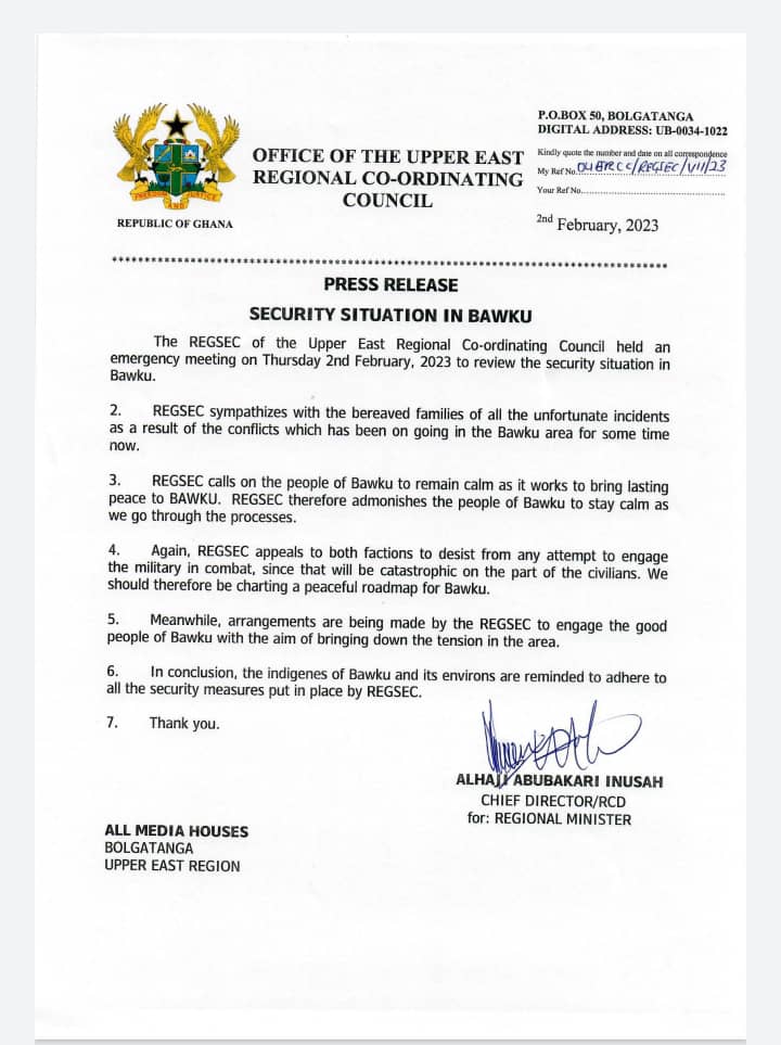 “REGSEC calls on the people of Bawku to remain calm as it works to bring lasting peace to Bawku. REGSEC therefore admonishes the people of Bawku to stay calm as we go through the processes,” REGSEC said in a statement following its emergency meeting held on Thursday, February 7, 2023, to review the security situation in Bawku.