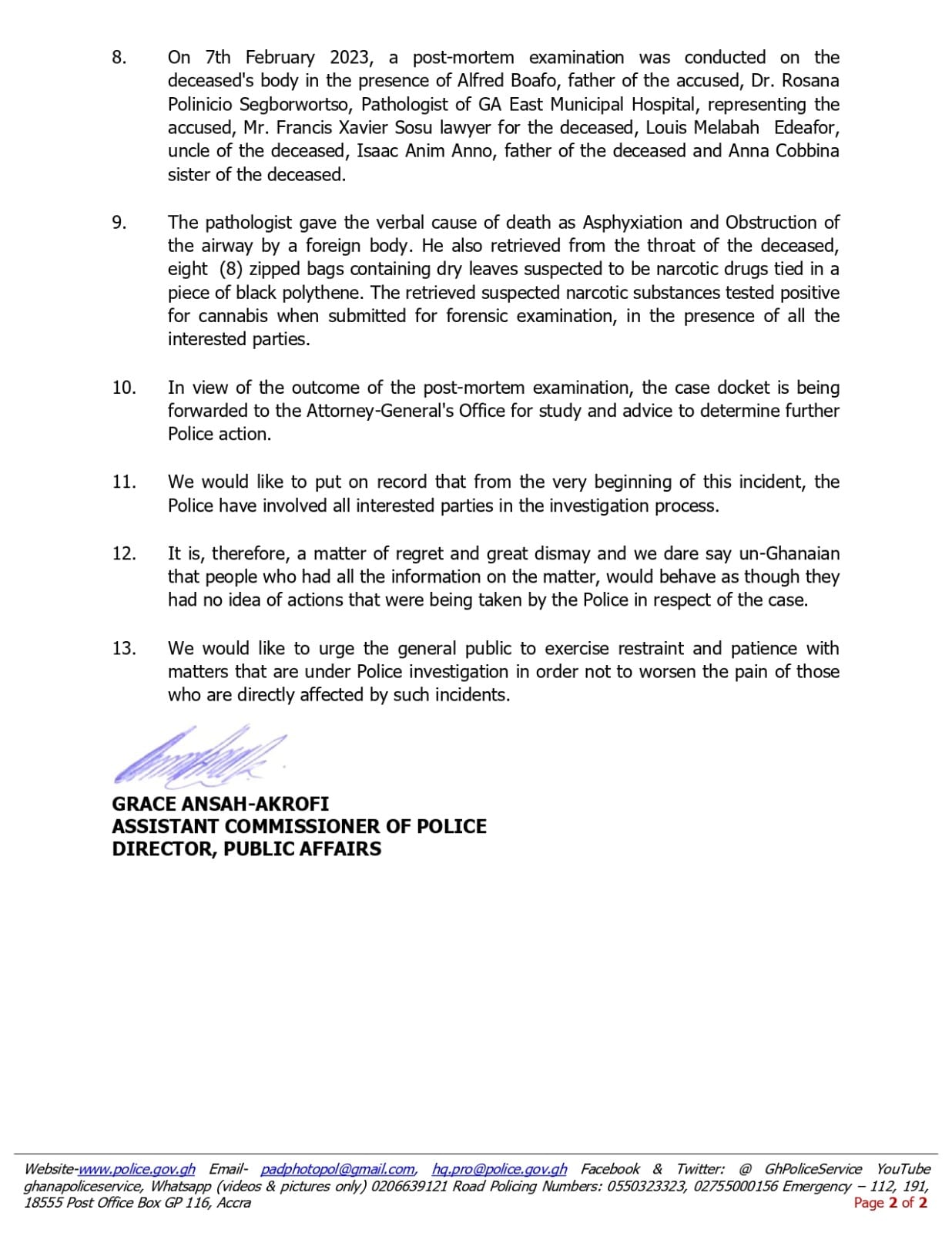 The retrieved, suspected narcotic substances tested positive for cannabis when submitted for forensic examination, in the presence of all the interested parties. In view of the outcome of the post-mortem examination, the case docket is being forwarded to the Attorney-General’s Office for study and advice to determine further police action,” the statement added.