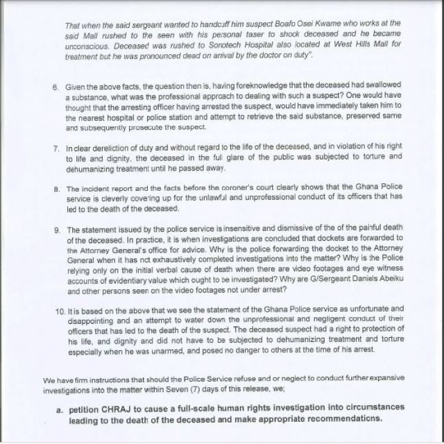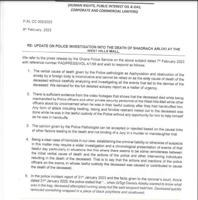 According to the lawyer from FX Law and Associates, Francis-Xavier Sosu, in a statement, there is sufficient evidence from video footages that shows that the deceased died while being manhandled by Police officers and other private security personnel of the West Hills Malls.