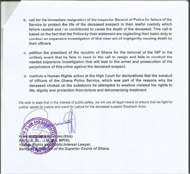 The Legal Team for the family of Shadrach Arloo, the man who was allegedly killed by a police officer and a private guard at the West Hills Mall in Accra have threatened to cause the removal of the Inspector General of Police (IGP) from his post.