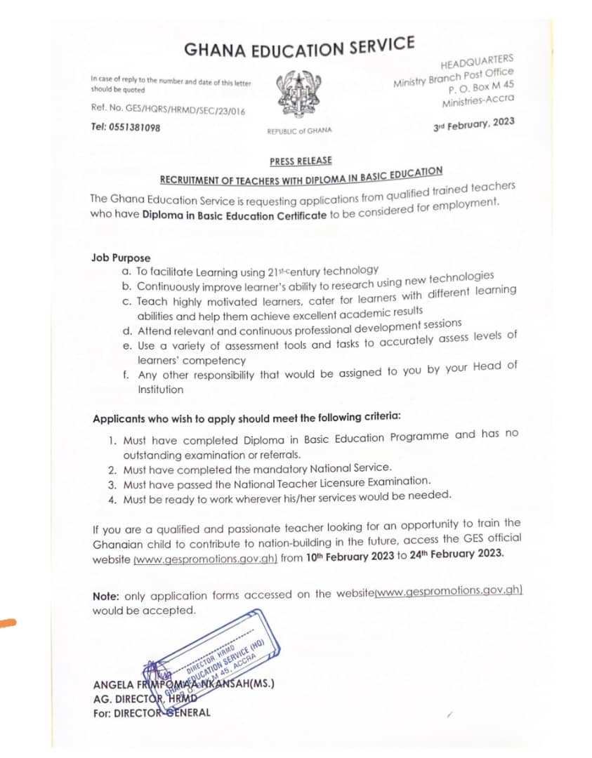This was contained in a statement signed by Ms Angela Frimpomaa Nkansah, the Acting Director, Human Resource Management Department, GES.