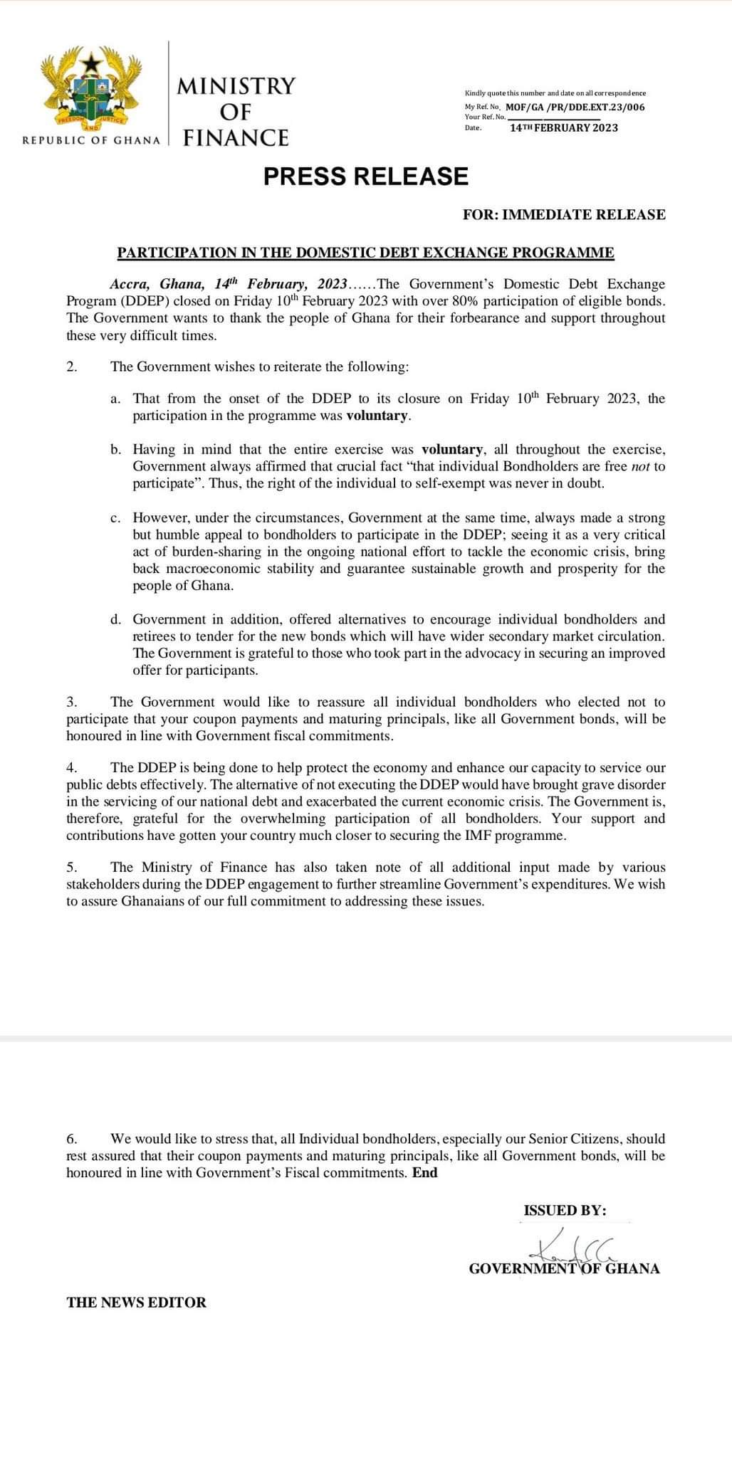 The assurance was given in a statement issued by the Government of Ghana on February 14, 2023, which sought to appreciate the participation of 80% eligible bonds in the DDEP.