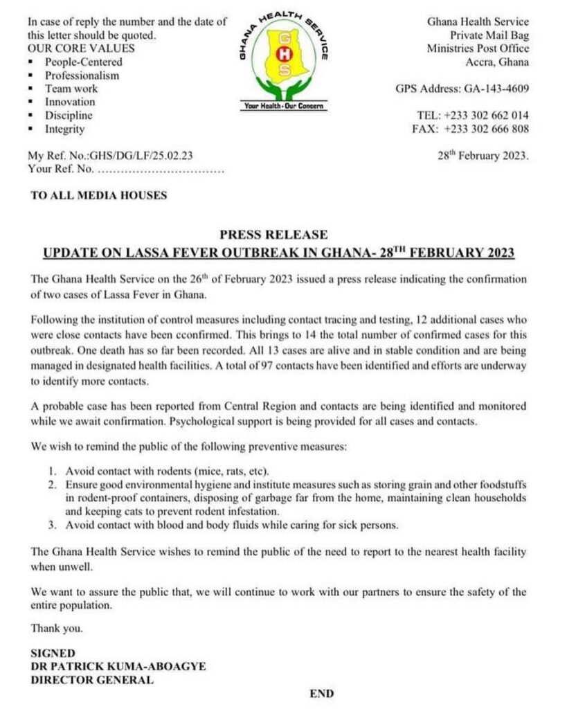 The Ghana Health Service (GHS) has confirmed that twelve new cases of Lassa Fever have been recorded in the country after the first two cases were announced on February 26, 2023.