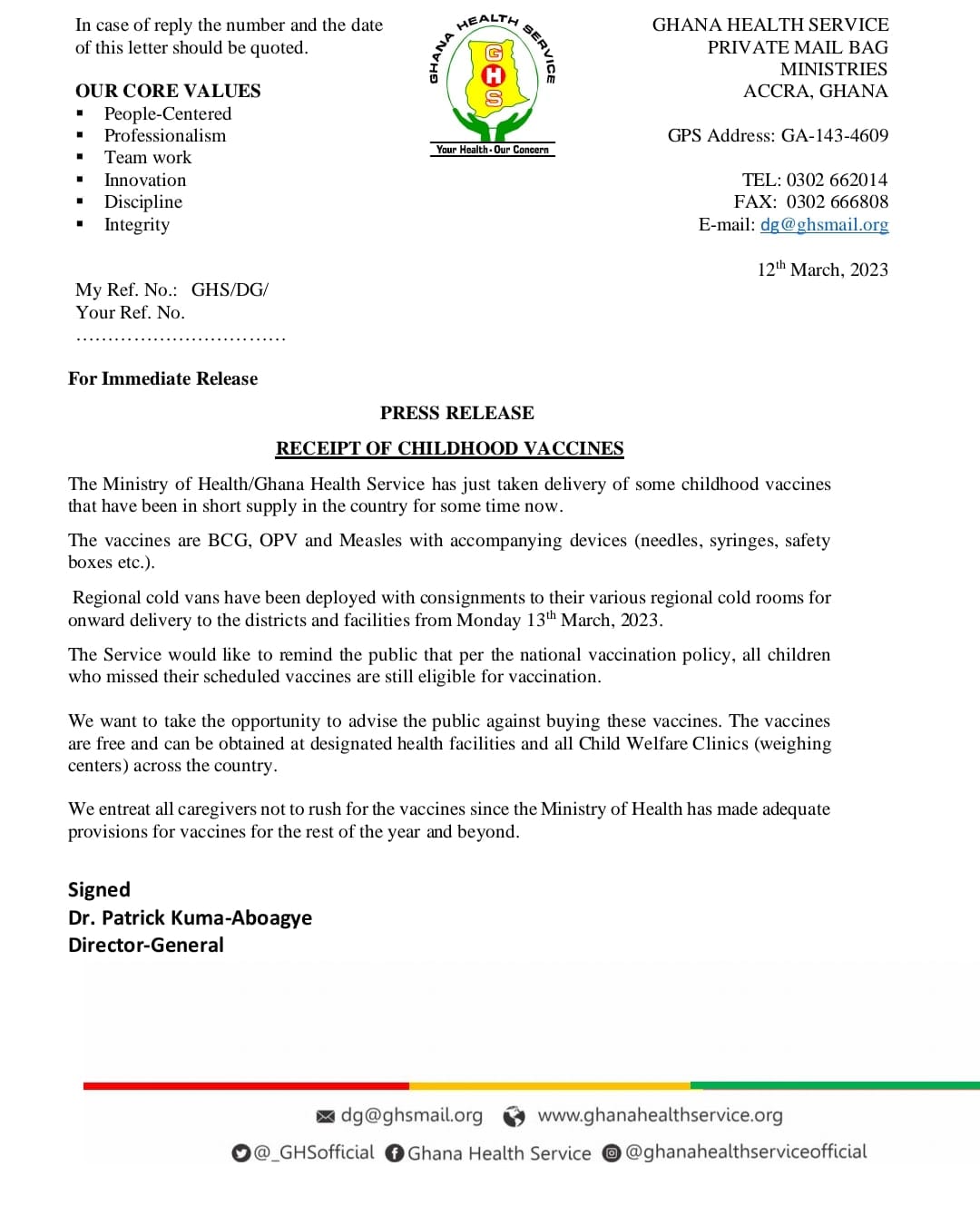 “We want to take this opportunity to advise the public against buying these vaccines. The vaccines are free and can be obtained at designated health facilities and Child Welfare Clinics (Weighing centres) across the country,” the GHS noted.