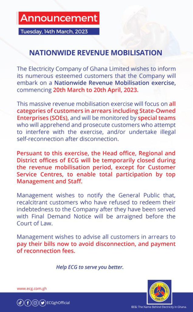 The Electricity Company of Ghana (ECG) has announced that beginning Monday, March 20, 2023, it shall close down all of its offices across the country as it seeks to embark on a nationwide revenue mobilisation exercise.