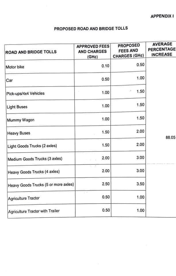 According to the revision, motorbikes are expected to now pay 50p, while saloon cars pay GHC1, heavy buses will now pay GHC2 with heavy good trucks paying GHC3. Light buses will now pay GHC1.50, agriculture tractor and trailers paying GHC1.