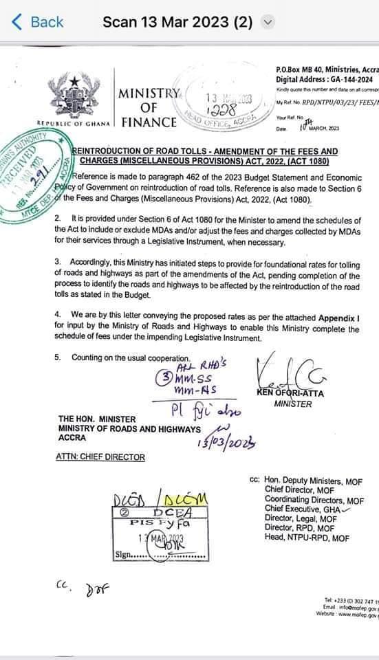 Contained in a letter signed by the sector Minister, Ken Ofori-Atta and addressed to the Ministry of Roads and Highways explained the proposed rates were for inputs by the Roads Ministry to enable the Finance Ministry to complete the schedule of fees.