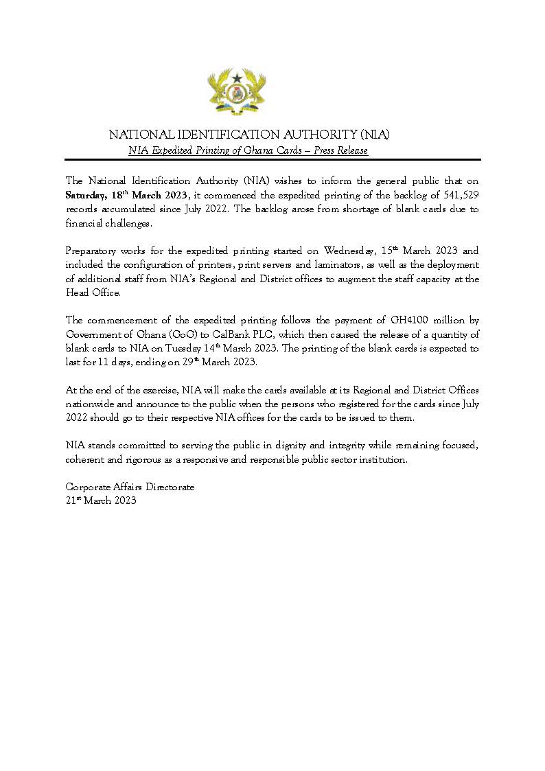 The National Identification Authority (NIA) has commenced the expedited of printing of the backlog of some 541,529 cards accumulated since July 2022.