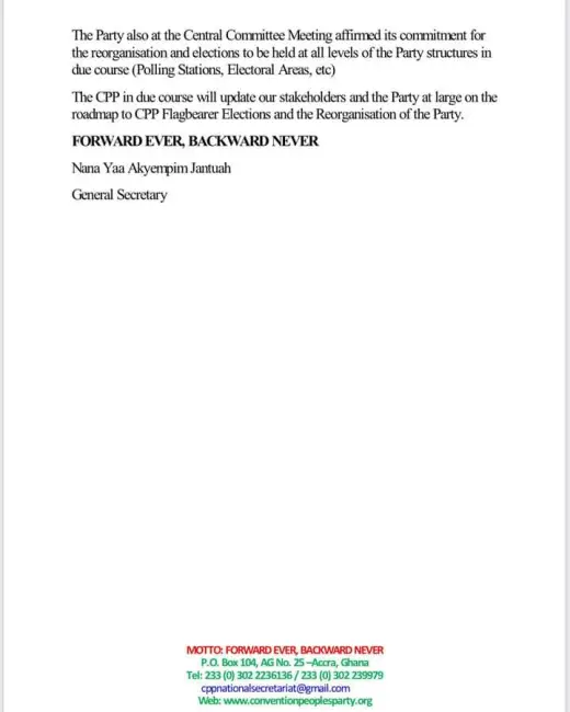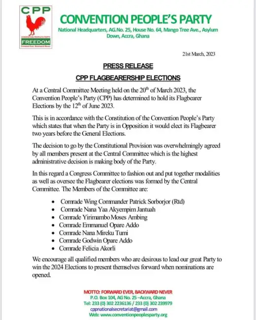 “At a central committee meeting held on 20 March 2023, the Convention People’s Party (CPP) has determined to hold its flagbearer elections by 12 June 2023.