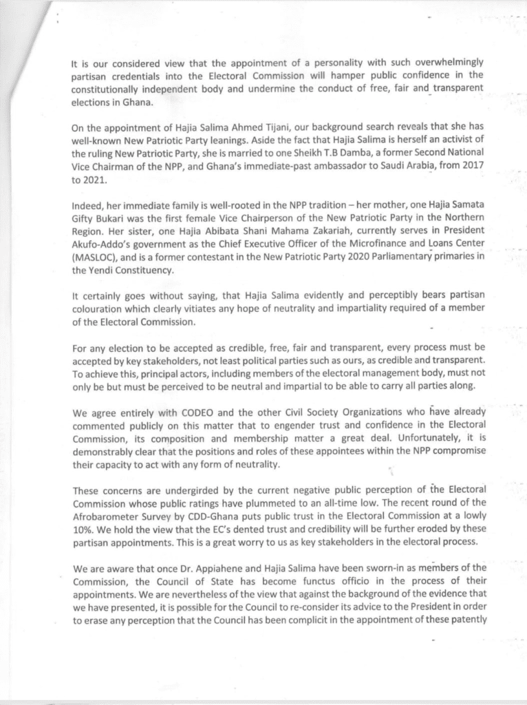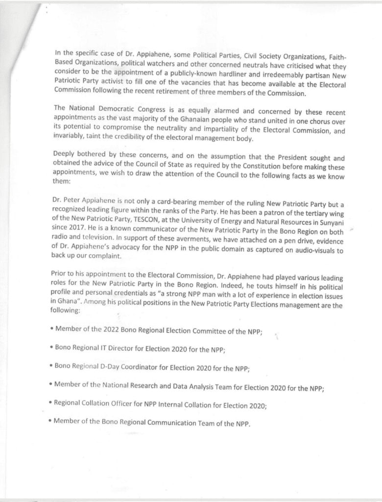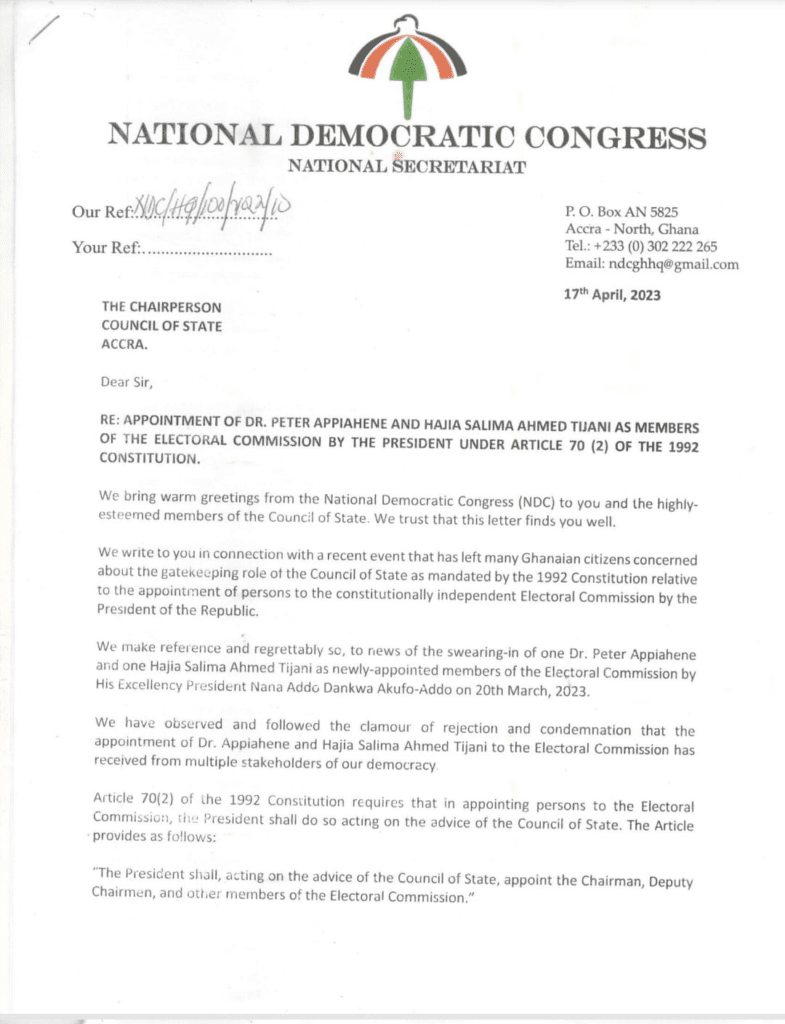 The opposition National Democratic Congress (NDC) has written to the Council of State calling for a review of the appointments of Hajia Salima Ahmed Tijani and Dr Peter Appiahene to the Electoral Commission.