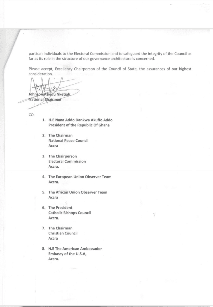 The petition added “Nevertheless of the view that against the background of the evidence that we have presented, it is possible for the Council to re-consider its advice to the President in order to erase any perception that the Council has been complicit in the appointment of these patently partisan individuals to the Electoral Commission and to safeguard the integrity of the Council as far as its role in the structure of our governance architecture is concerned.”
