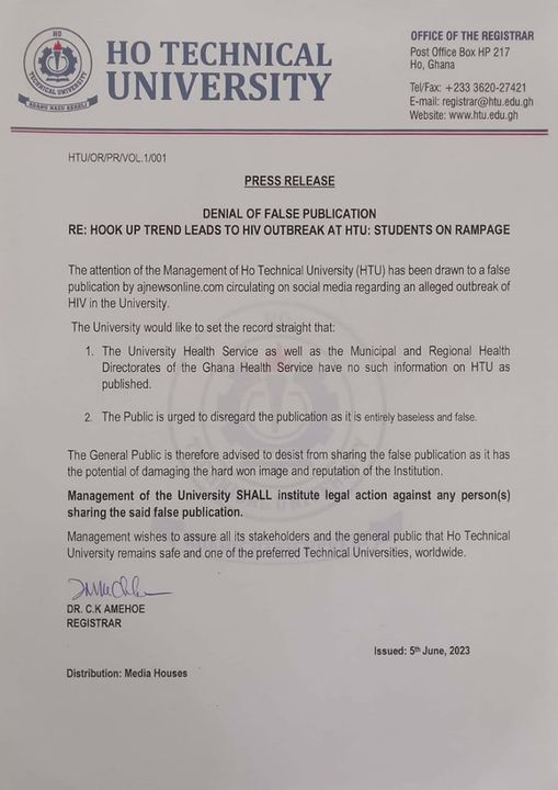 The Ho Technical University has reacted to a publication making rounds on social media alleging an outbreak of Human Immunodeficiency Virus (HIV) in the university.