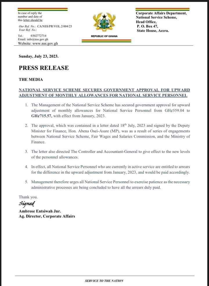 “The Management of the National Service Scheme has secured government approval for upward adjustment of monthly allowances for National Service Personnel from GH¢559.04 to GH¢715.57, with effect from January 2023.