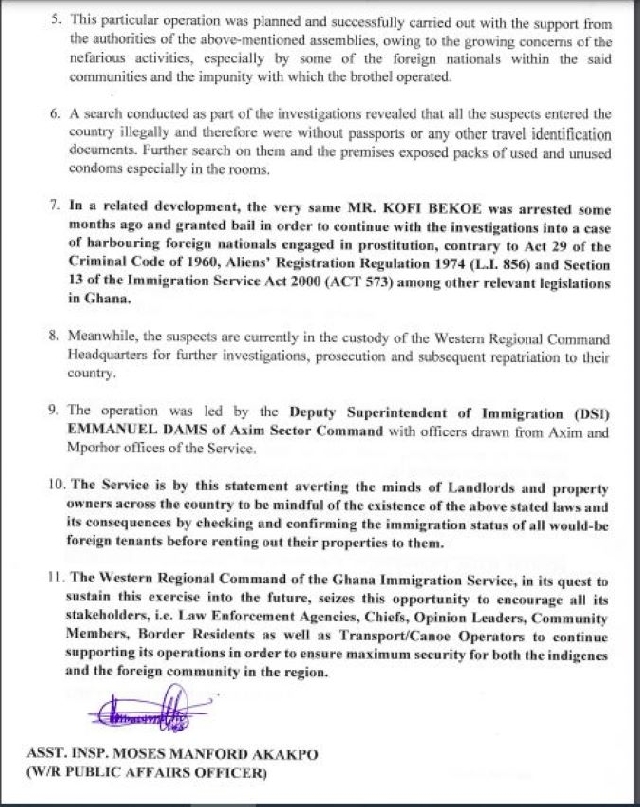 “This particular operation was planned and successfully carried out with the support from the authorities of the above-mentioned assemblies, owing to the growing concerns of the nefarious activities, especially by some of the foreign nationals within the said communities, and the impunity with which the brothel operated,” the GIS stated.