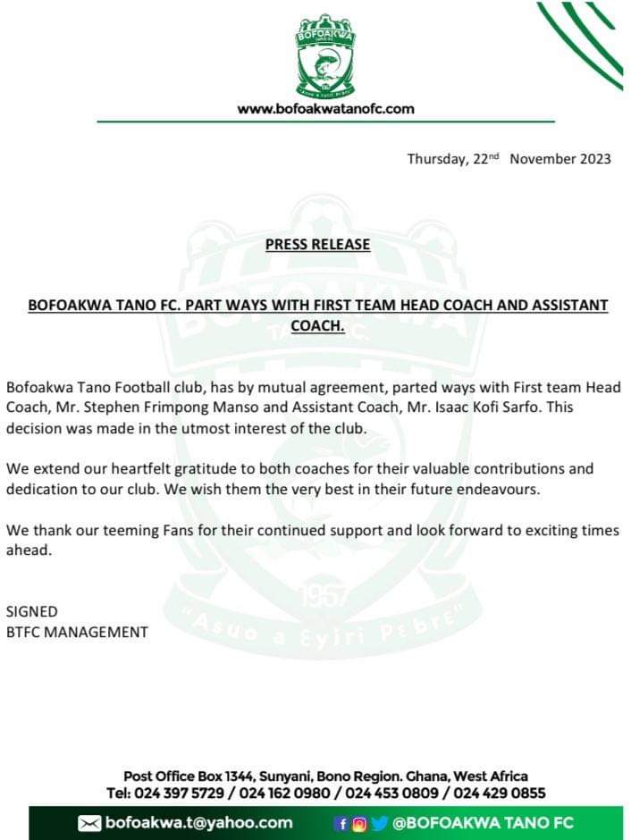 Ghanaian Premier League club, Bofoakwa Tano, has announced the departure of Head Coach, Stephen Frimpong Manso, and his assistant, Isaac Kofi Sarfo.