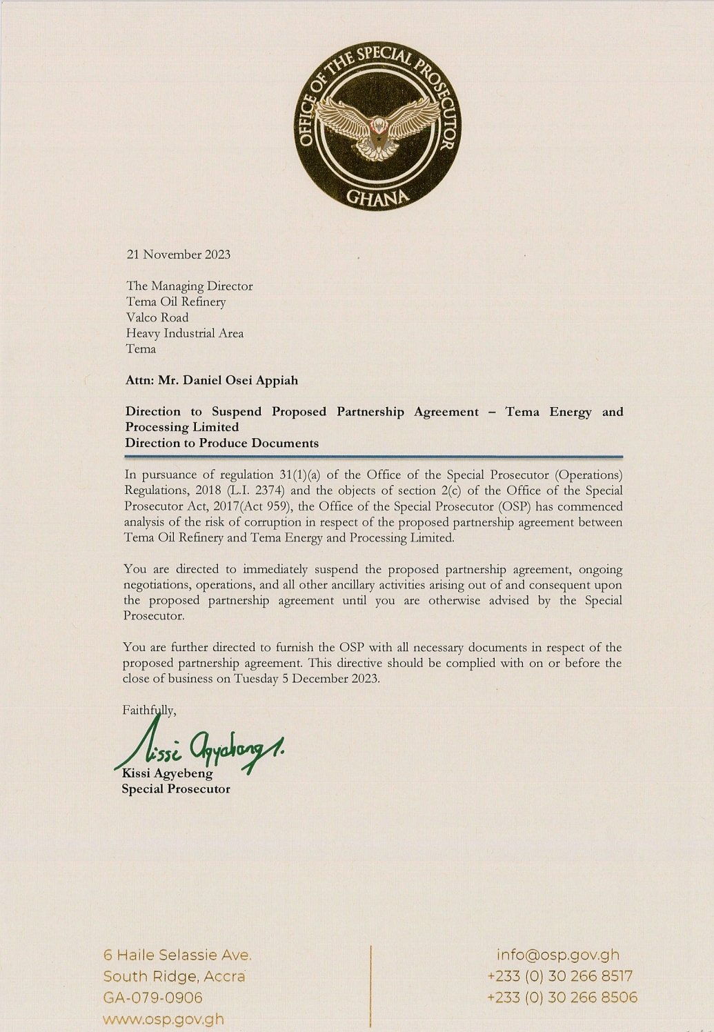 The Office of the Special Prosecutor (OSP) has issued a directive to the management of the Tema Oil Refinery (TOR) to suspend its proposed partnership agreement with Tema Energy and Processing Limited (TEPL).