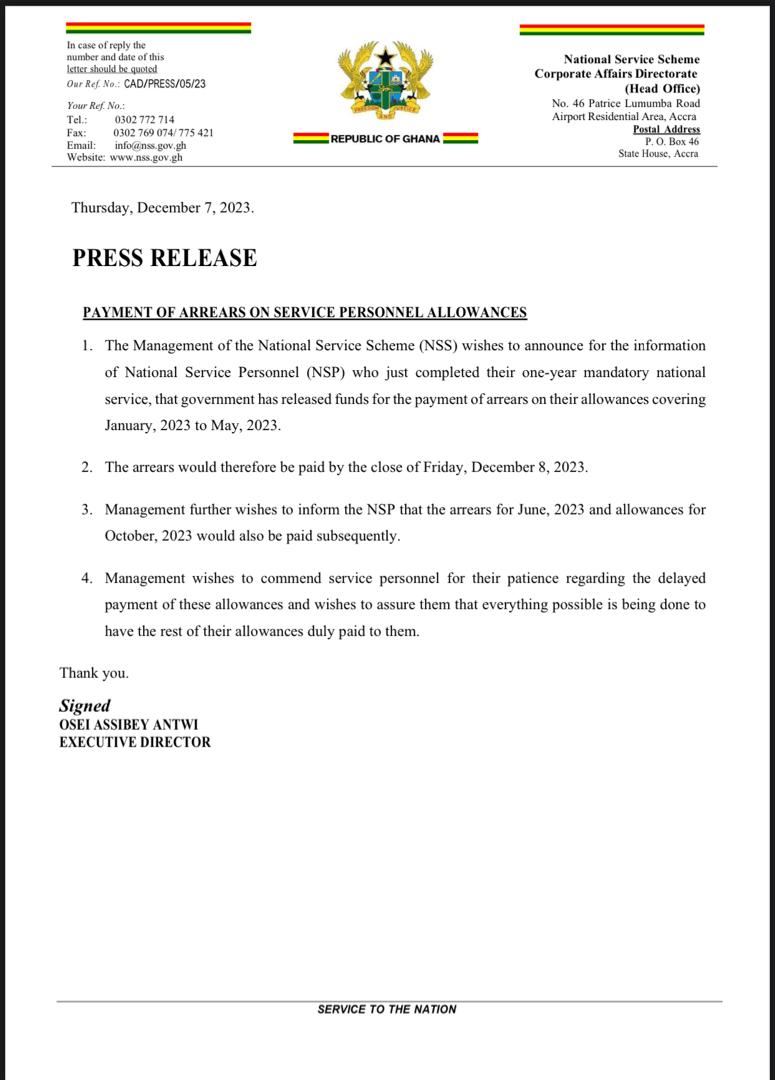 According to the NSS, the payment which covers arrears from January 2023 to May 2023, would be released Friday, December 8, 2023.