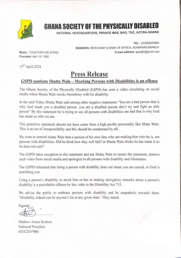 “By this statement, he is trying to say all persons with disabilities are bad that is why God has made us who we are. This primitive statement should not have come from a high-profile personality like Shata Wale,” the statement signed by its National President, Mathew Annor Kodom read.
