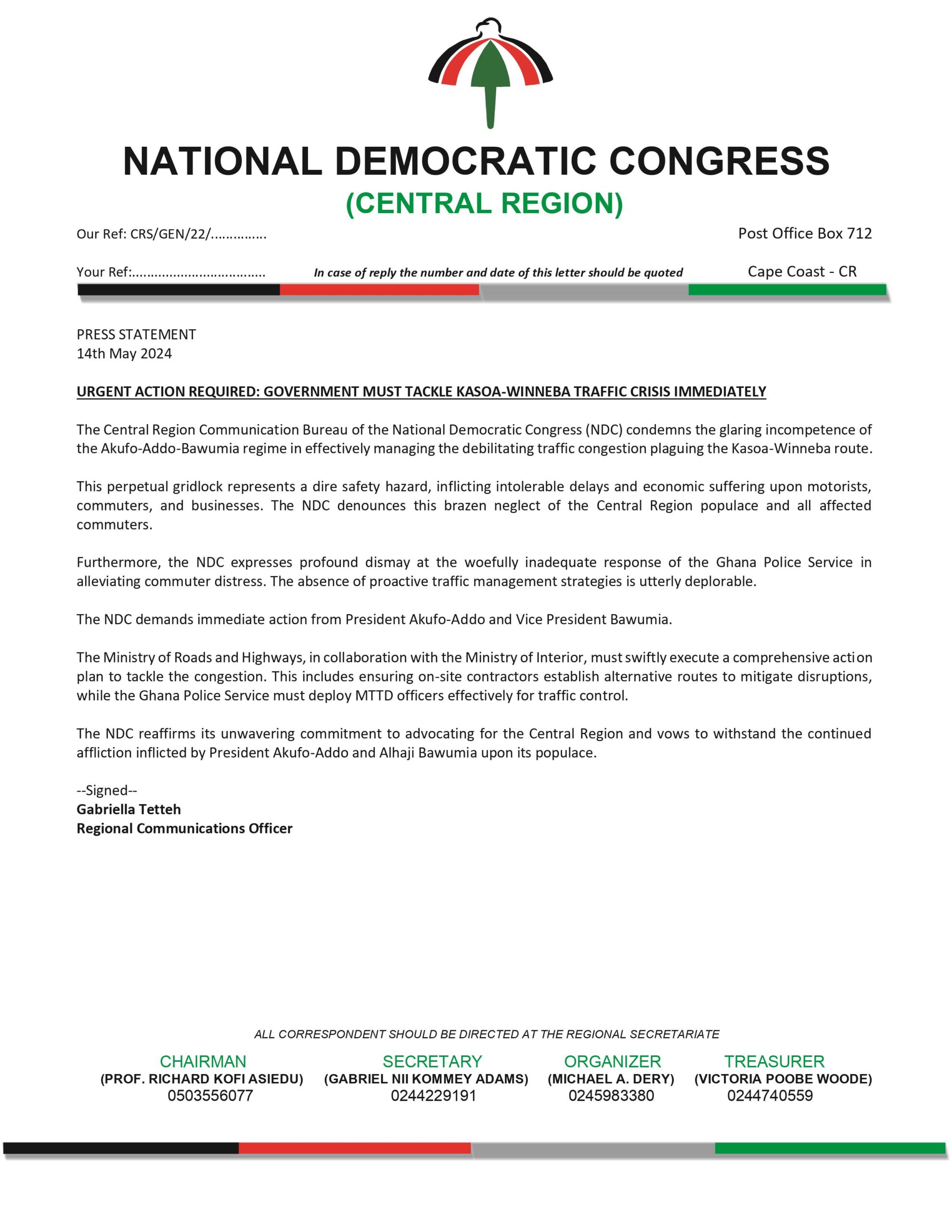 The Central Region Communication Bureau of the National Democratic Congress (NDC) has issued a pressing call for immediate government action to resolve the severe traffic congestion on the Kasoa-Winneba route.
