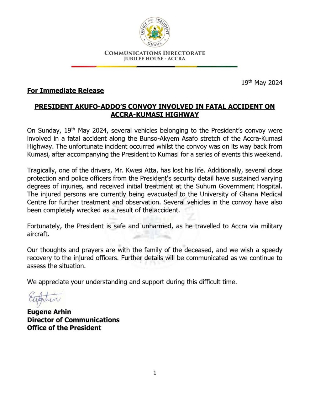 President Nana Akufo-Addo’s convoy was involved in a fatal road crash between Asafo and Bunso on the Kumasi-Accra highway Sunday, May 19, 2024.