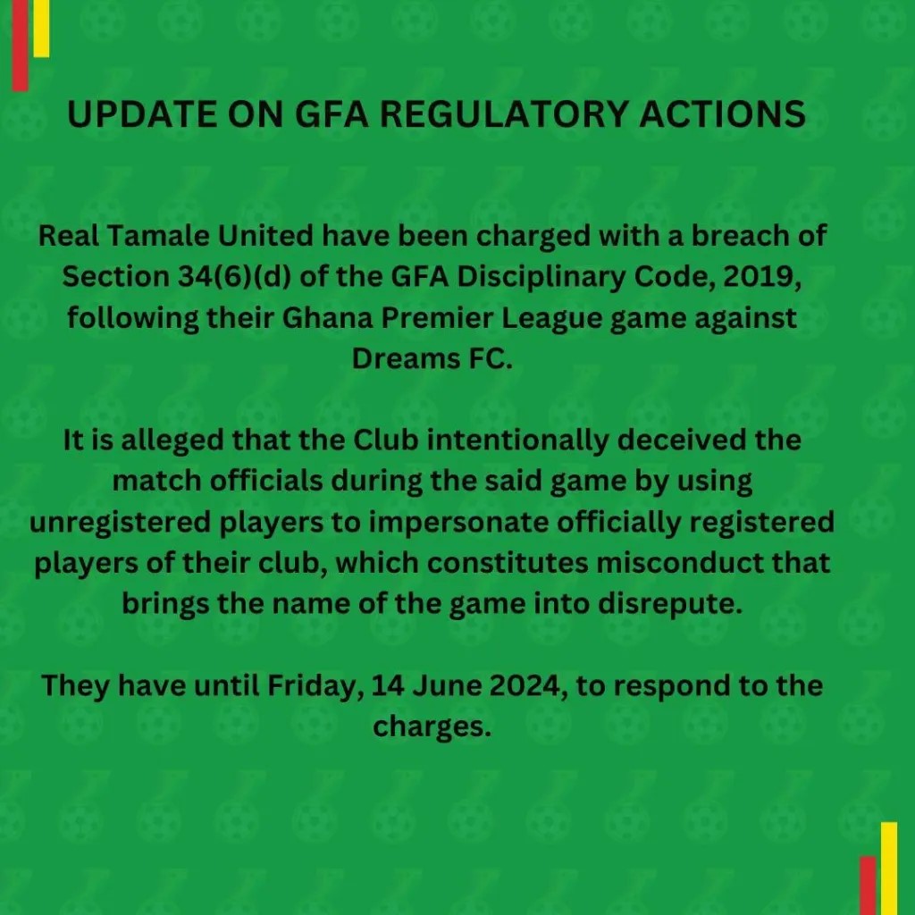 The Ghana Football Association (GFA) has formally charged Real Tamale United (RTU) with a breach of Section 34(6)(d) of the GFA Disciplinary Code, 2019.