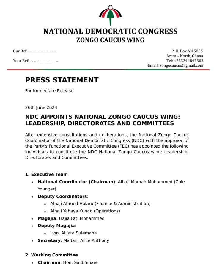 The opposition National Democratic Congress (NDC) has announced members for its National Zongo Caucus Wing.