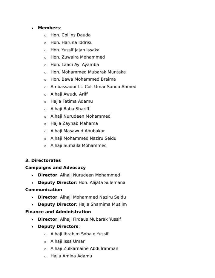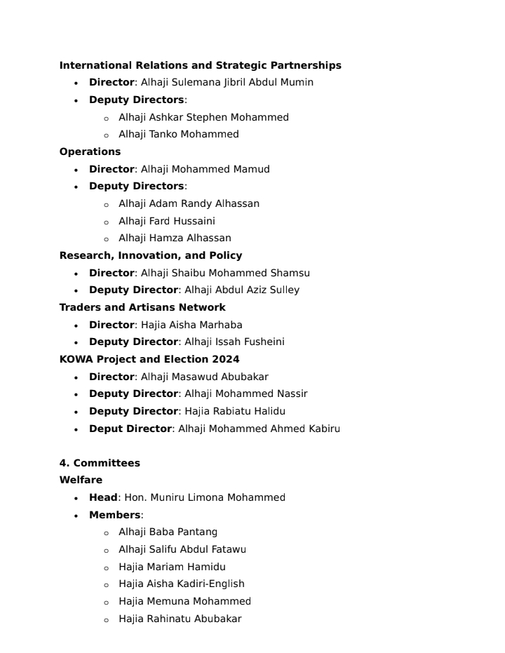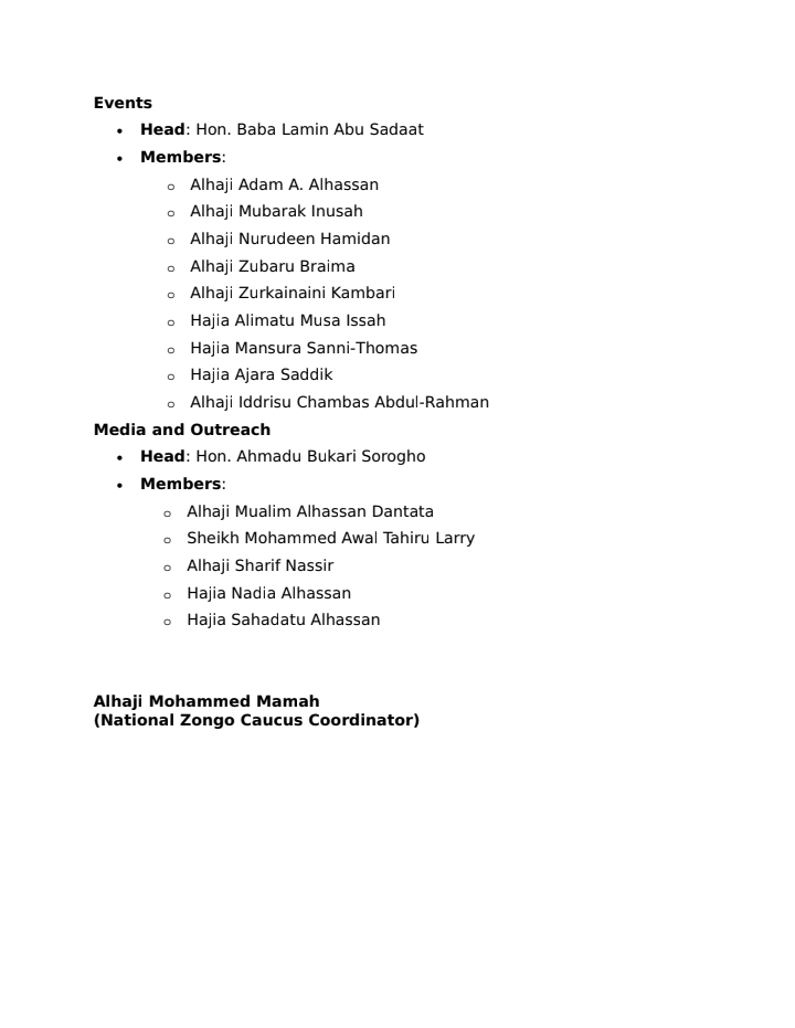 The Zongo caucus wing is made up of leadership for various directorates and committees.