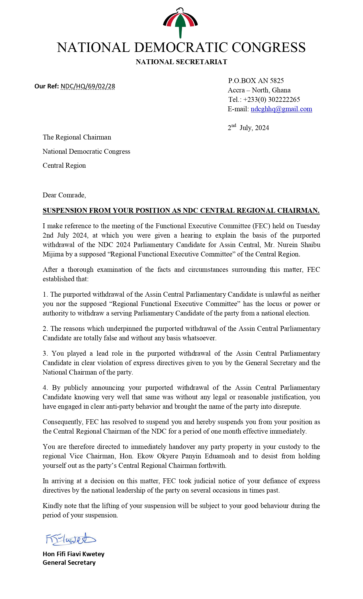 “In light of these findings, the FEC resolved to suspend the Regional Chairman for one month. He has been instructed to hand over all party property to the regional Vice Chairman, Ekow Okyere Panyin Eduamoah, and to cease all activities as the Central Regional Chairman during this period.