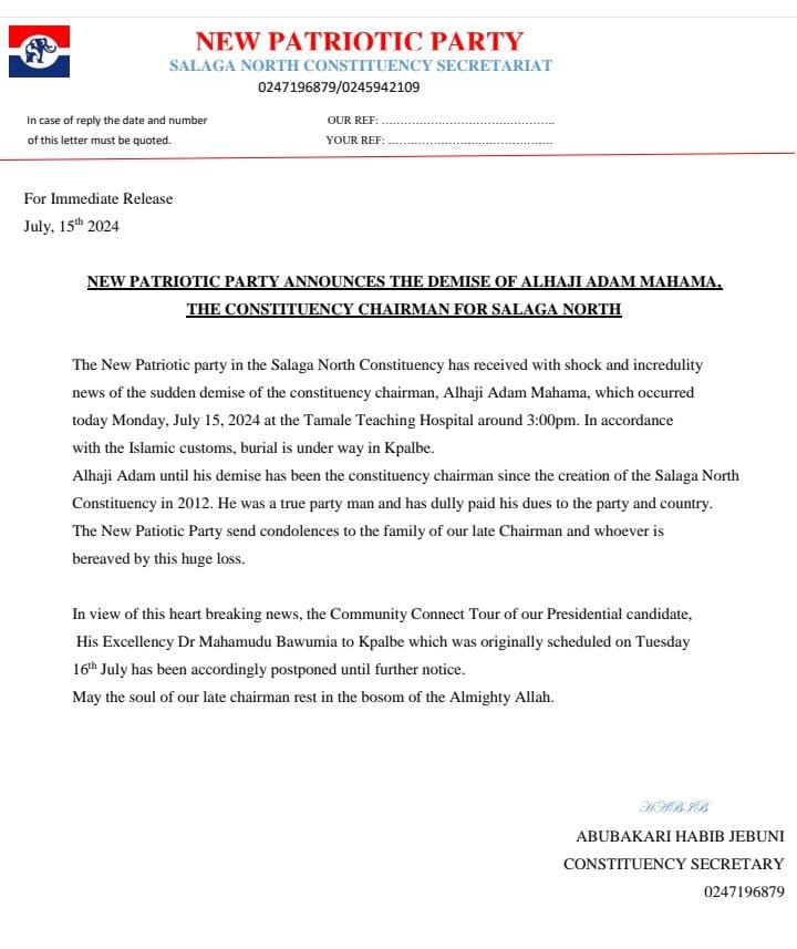 “Alhaji Mahama until his demise has been the constituency chairman since the creation of the Salaga North Constituency in 2012. He was a true party man and has truly paid his dues to the party and country…,” part of a statement announcing his death stated.