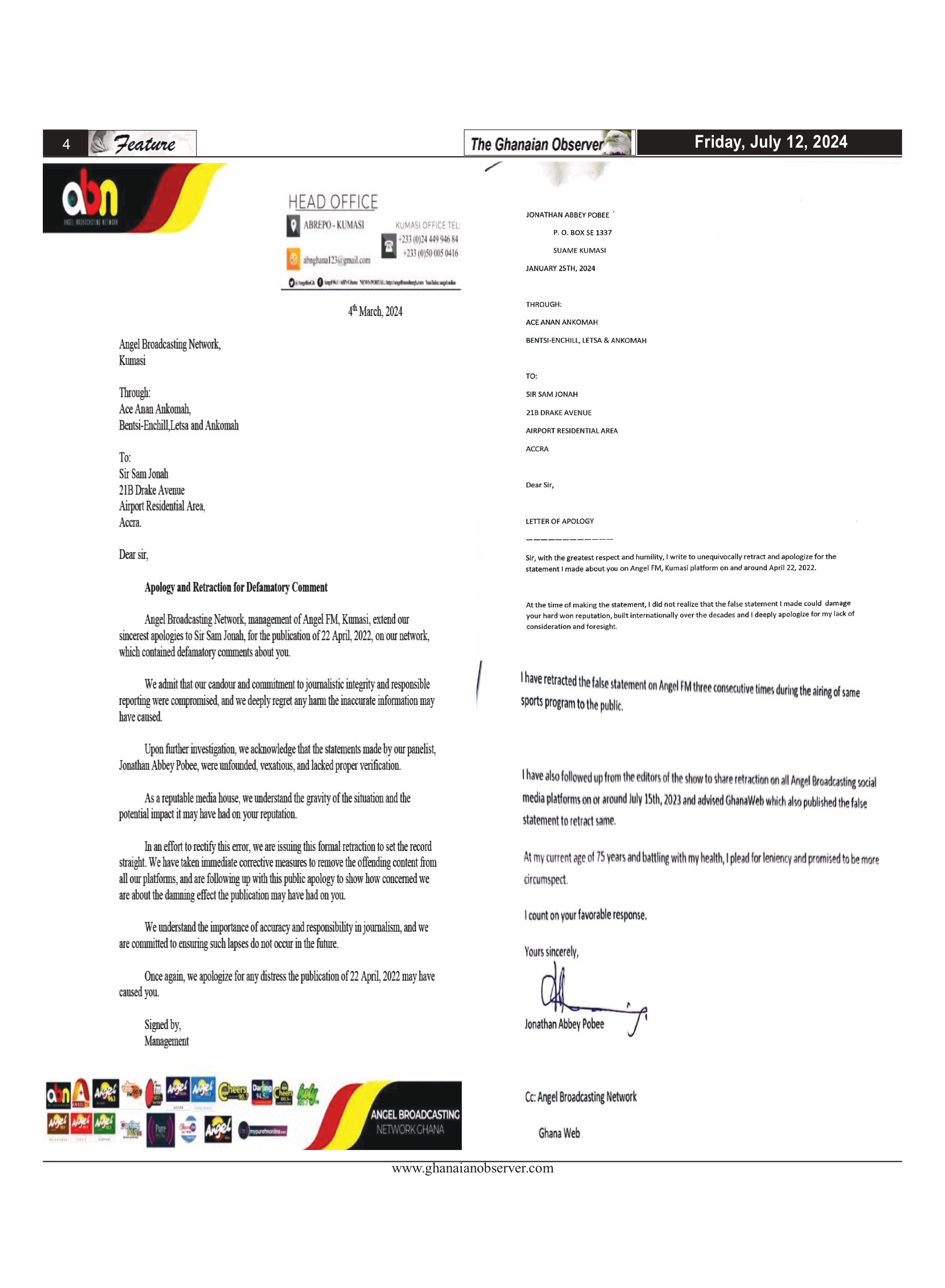 Angel Broadcasting Network (ABN) particularly, the management of Angel FM Kumasi, have formally apologised to business magnate, Sir Sam Jonah and expressed deep regret over unfounded comments passed by Jonathan Abbey Pobee, a panelist of on one of its sports programmes.