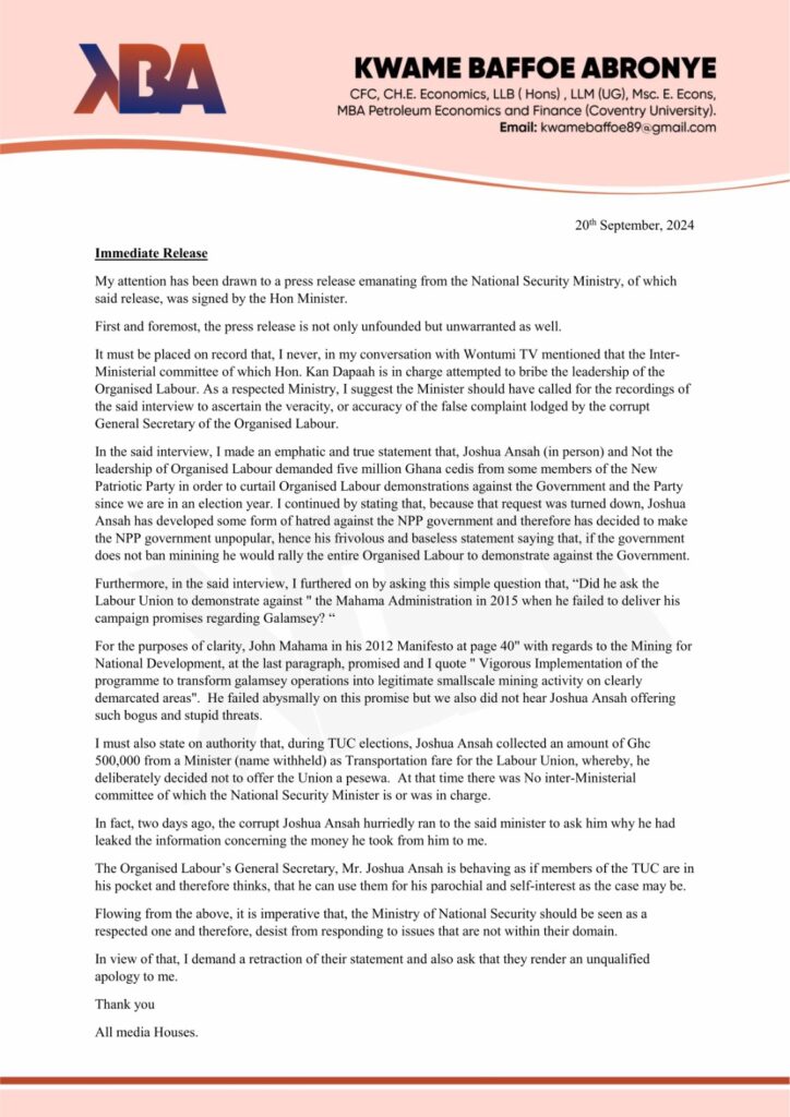 A press statement from National Security ministry had dismissed allegations purportedly made by Kwame Baffoe that the leadership of Organised Labour demanded money to call off a planned strike.