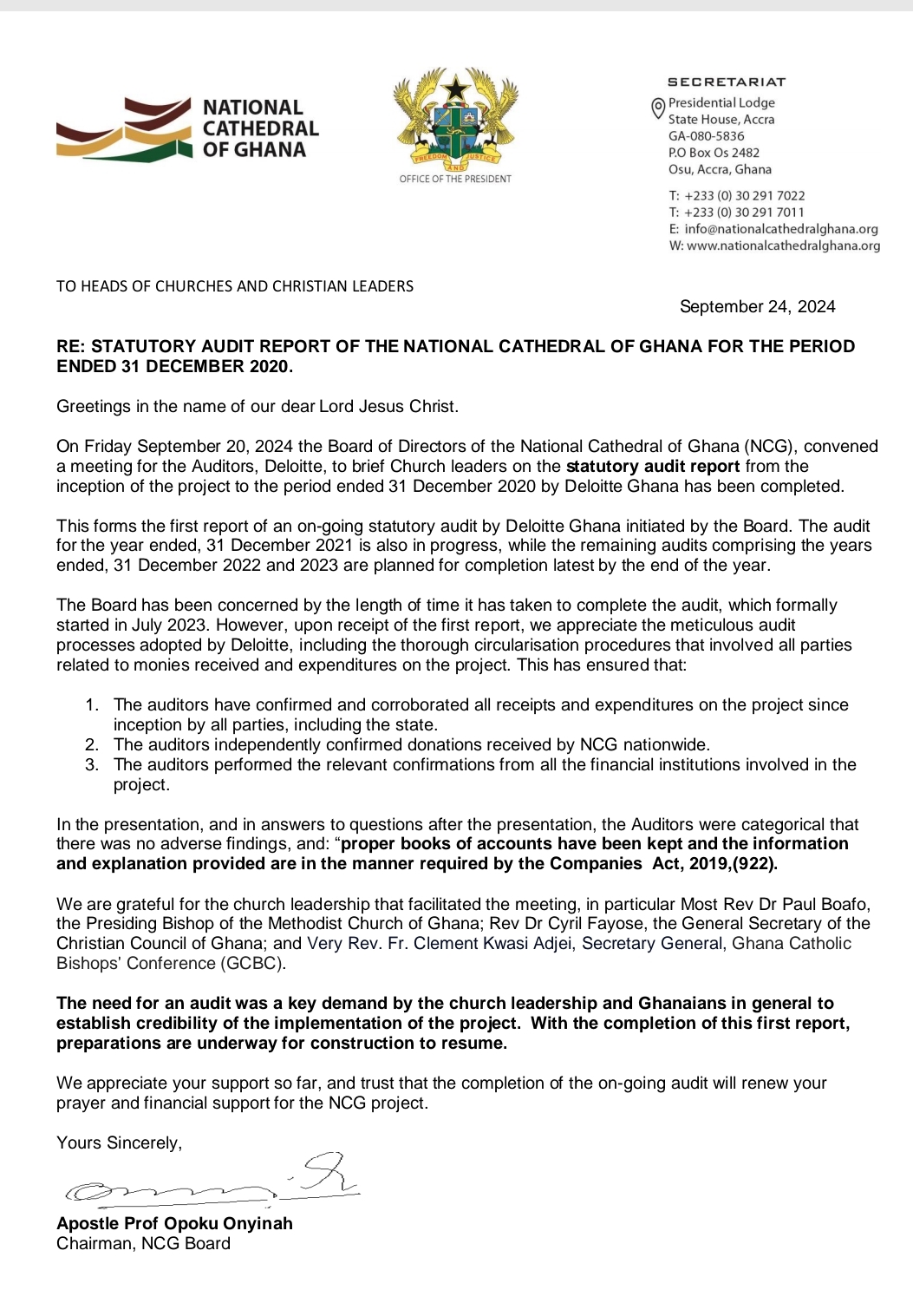 This announcement followed a meeting between the Board of Directors of the NCG and the Auditors, Deloitte, to brief Church leaders on the statutory audit report from the inception of the project to the period ended 31 December 2020 by Deloitte Ghana has been completed.